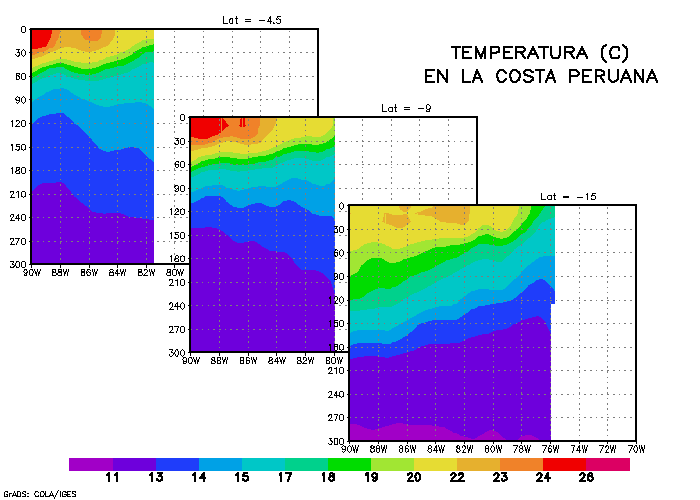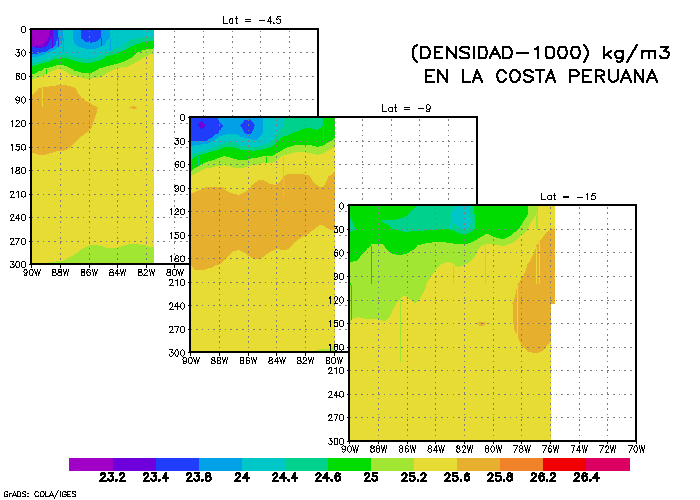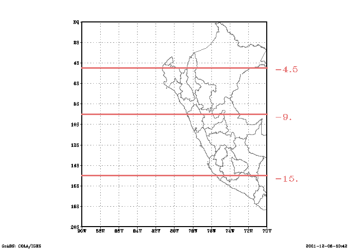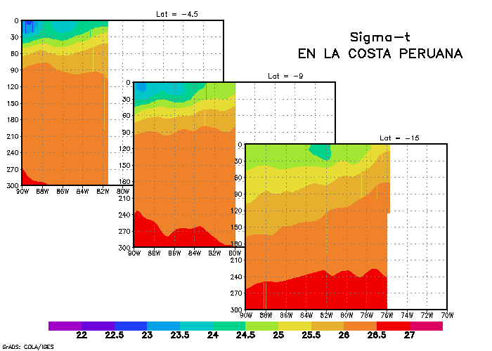 Media Anual de Salinidad y Temperatura de LEVITUS a 1/4 de gradoEn este página se muestran algunas estructuras horizontales y verticales de la Temperatura, Salidad, Masa de Agua y Sigma-t en la Costa Peruana. Los datos pertencen a Levitus y pueden ser obtenidos via http o ftp a: ftp.nodc.noaa.gov en el directorio /pub/WOA94/data/ Elegí las secciones verticales en las latitudes -4.5, -9.0 y -15.0 para comparar con los datos de Salvador Zuta y Oscar Guillen en el BOLETIN No. 5 del Instituto del Mar del Perú Las ubicación de las seciones latitudinales se puede apreciar en el siguiente gráfico: ![]() A) Temperatura![]() B) Salinidad![]() En las zonas norte y cerca del Ecuador el agua es menos salina que en el Sur. Esto coincide con las zonas de mayor precipitación. Mientras que la zona sur conincide con la zonas de mayor evaporación. (Zuta,1970) C) Masas de AguaPara hallar las Masas de Agua en las Costas Peruanas, se usaron los criterios de S. Zuta Y Oscar Guillen.
